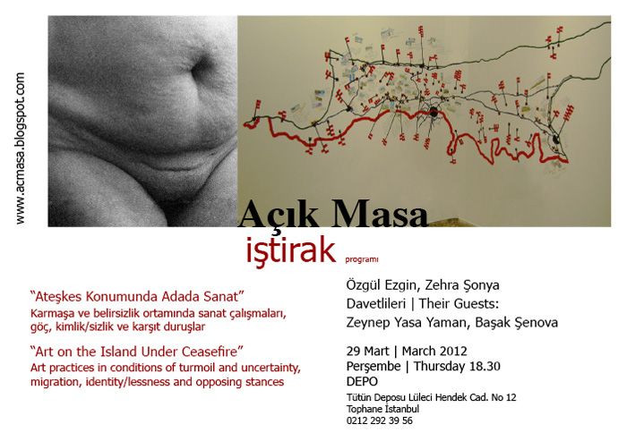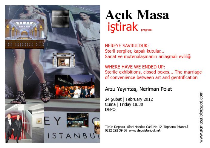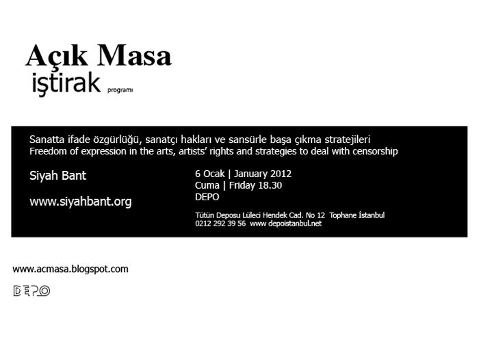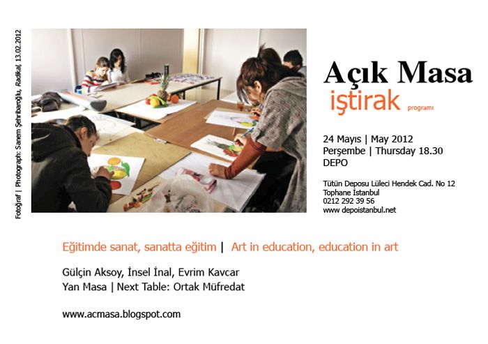 A monthly discussion program titled  Open Table has been initiated at Depo in 2010. Open Table is organized by artist Mürüvvet Türkyılmaz and some of the issues focused in the first year of the program in the discussions between invited artists, curators, collectives, critics and lecturers working in different fields are: the role of art in gentrification, militarism and war economy, art criticism, artistic practices in public spaces, participatory art, and curatorship. Documentation of all discussions organized last year is available at Depo to be watched and copied in dvd format.
