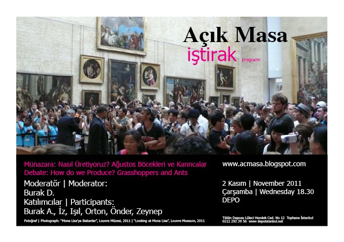 “In this “debate,” the differences / similarities between the changing conditions of art production in Turkey and forms of production in contemporary capitalism will be addressed and various exit strategies will be discussed. What kind of problems are actors working in the field of art, who can be defined as “creative subjects,” faced within this situation so-called “creative capitalism,” “social production,” or “factory society”? Should we work and produce more or should we abandon the context creating these problems and search for ways to create new situations? What are the limits of the validity of these two strategies, at which points do they include or exclude each other?