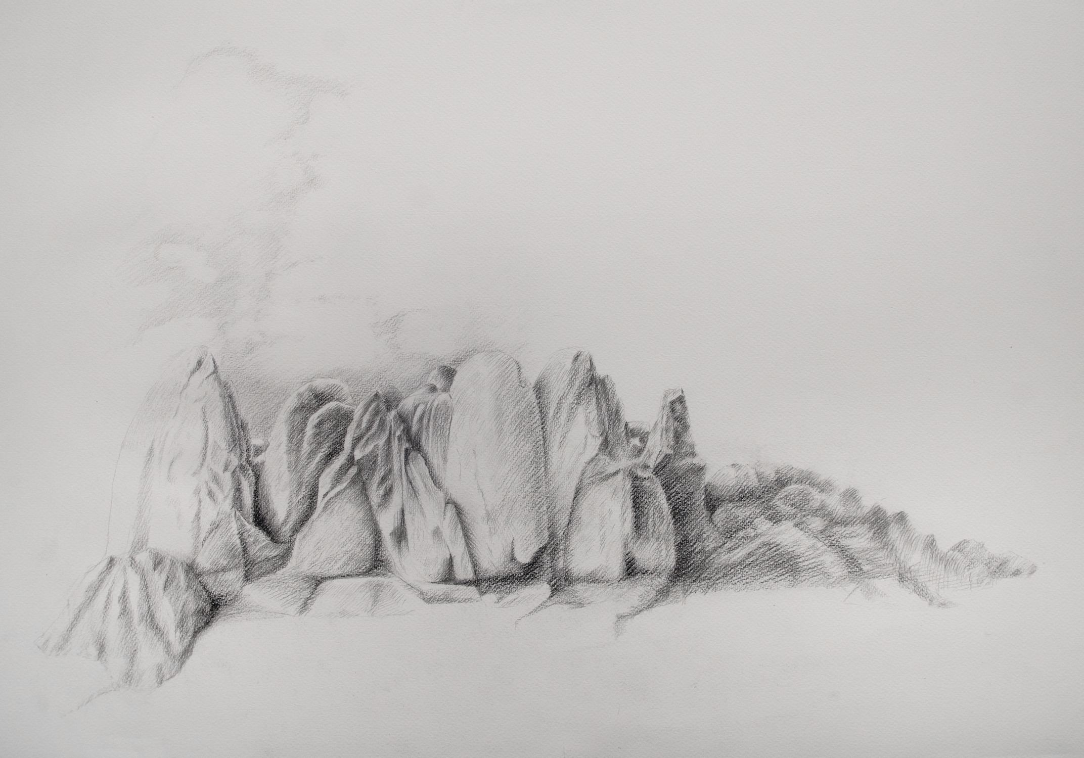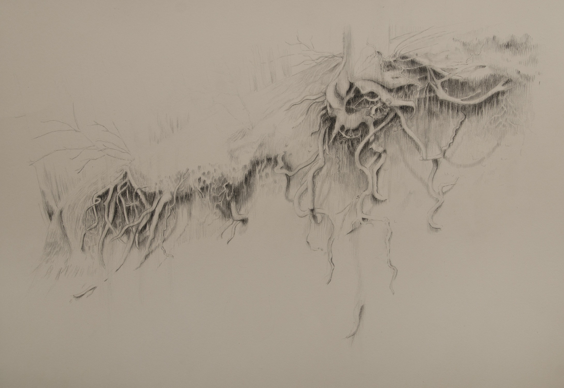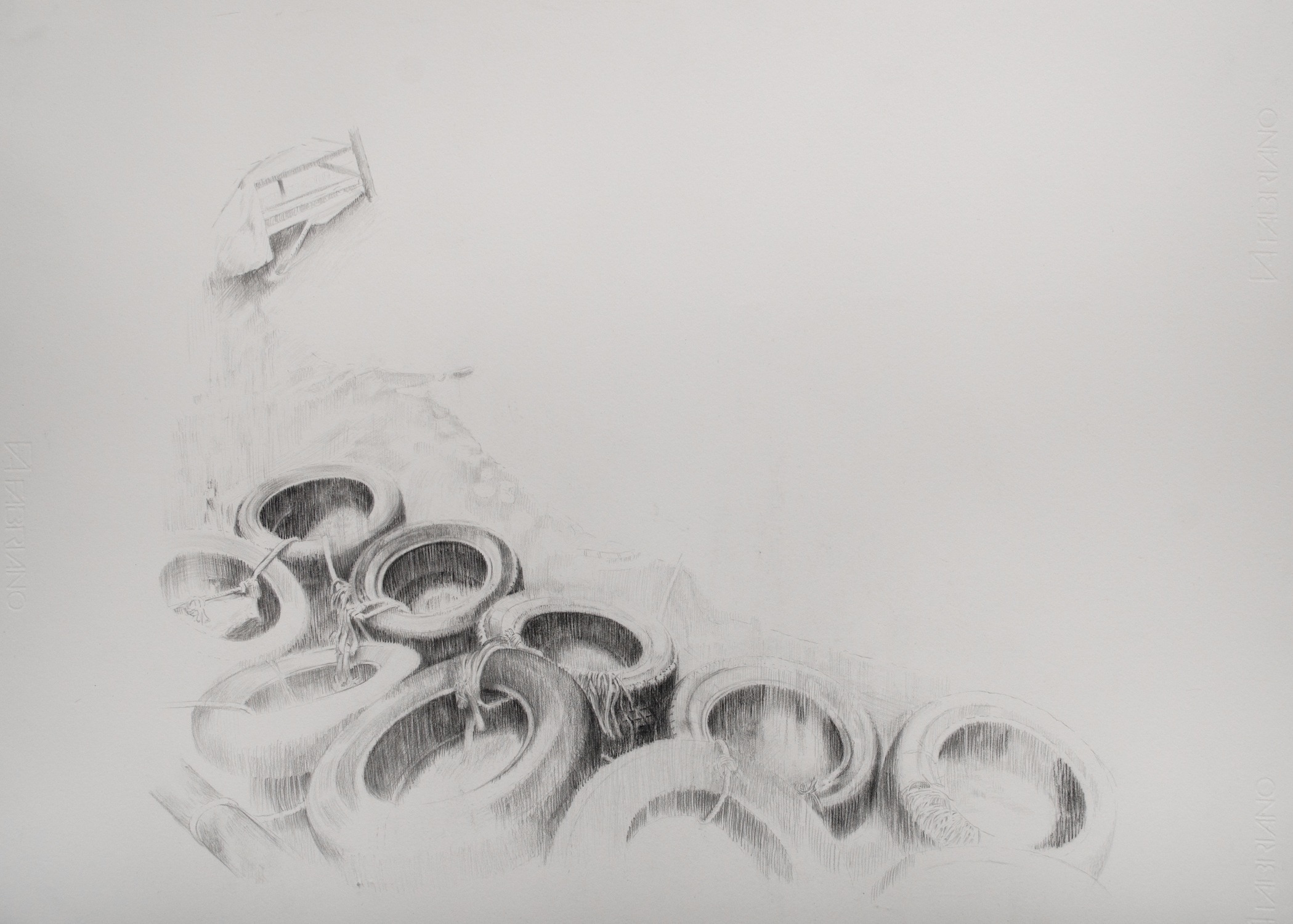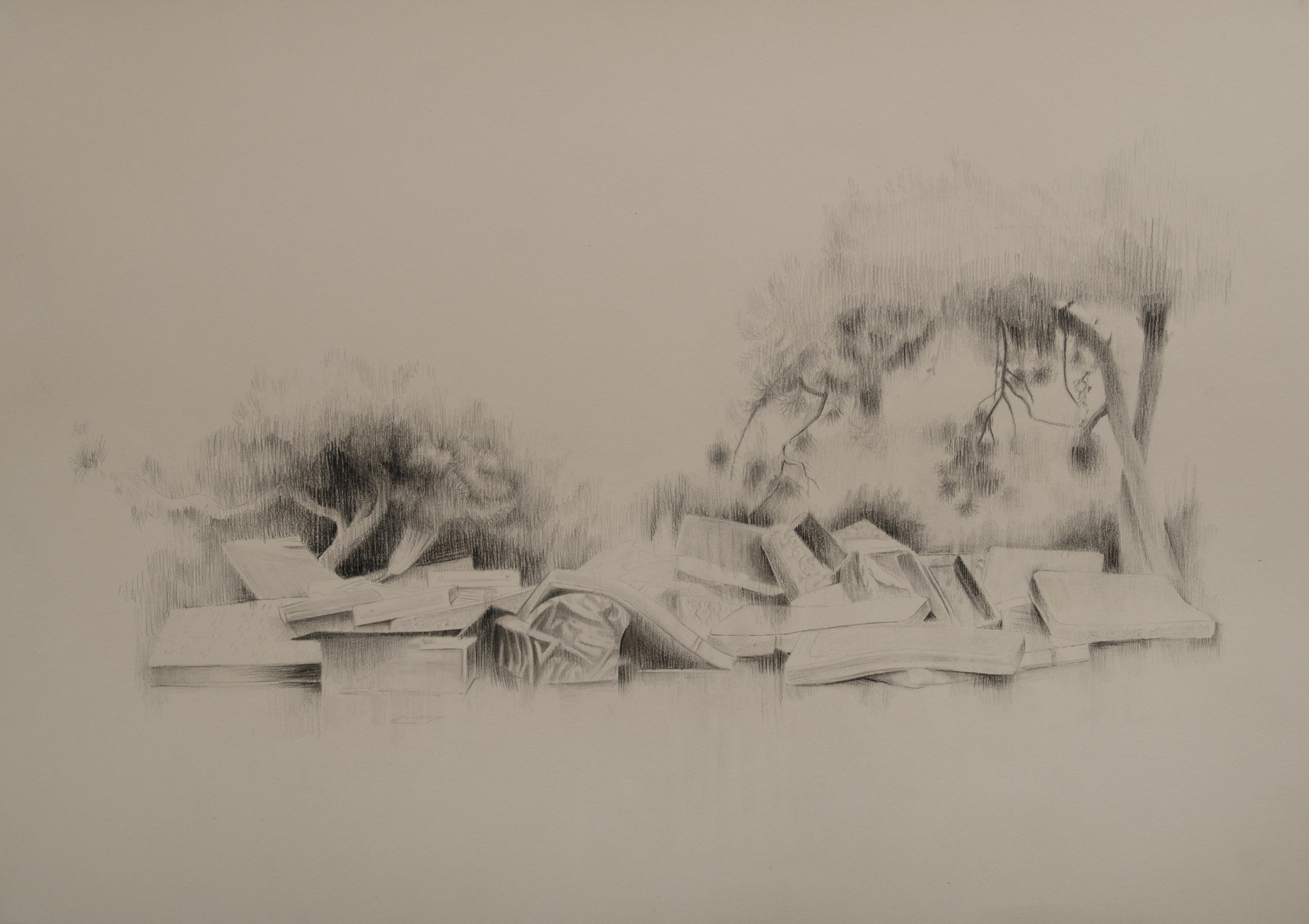 The drawings exhibited in “Looking” depict landscapes which include natural forms / details from pastoral scenery, together with artificial and/or dumped objects. More familiar views of landscape all of a sudden intertwine with images of dumped car tires, crates, mattresses or plastic water tanks.