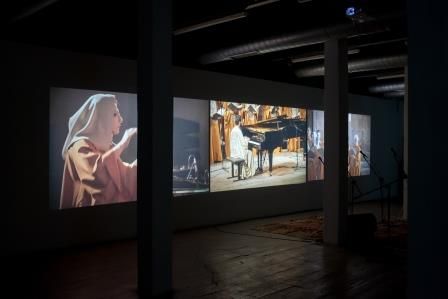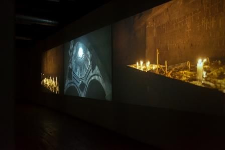 This is a 35-minute, 3 channel audio-visual installation. It features 3 life-sized screens with a combined length of nearly 50 ft that surround the audience on all sides. It uses projections, animations and sound design to immerse its audience in the journey and the music – it gives you a full body experience and transfers you to place outside of the exhibition space.