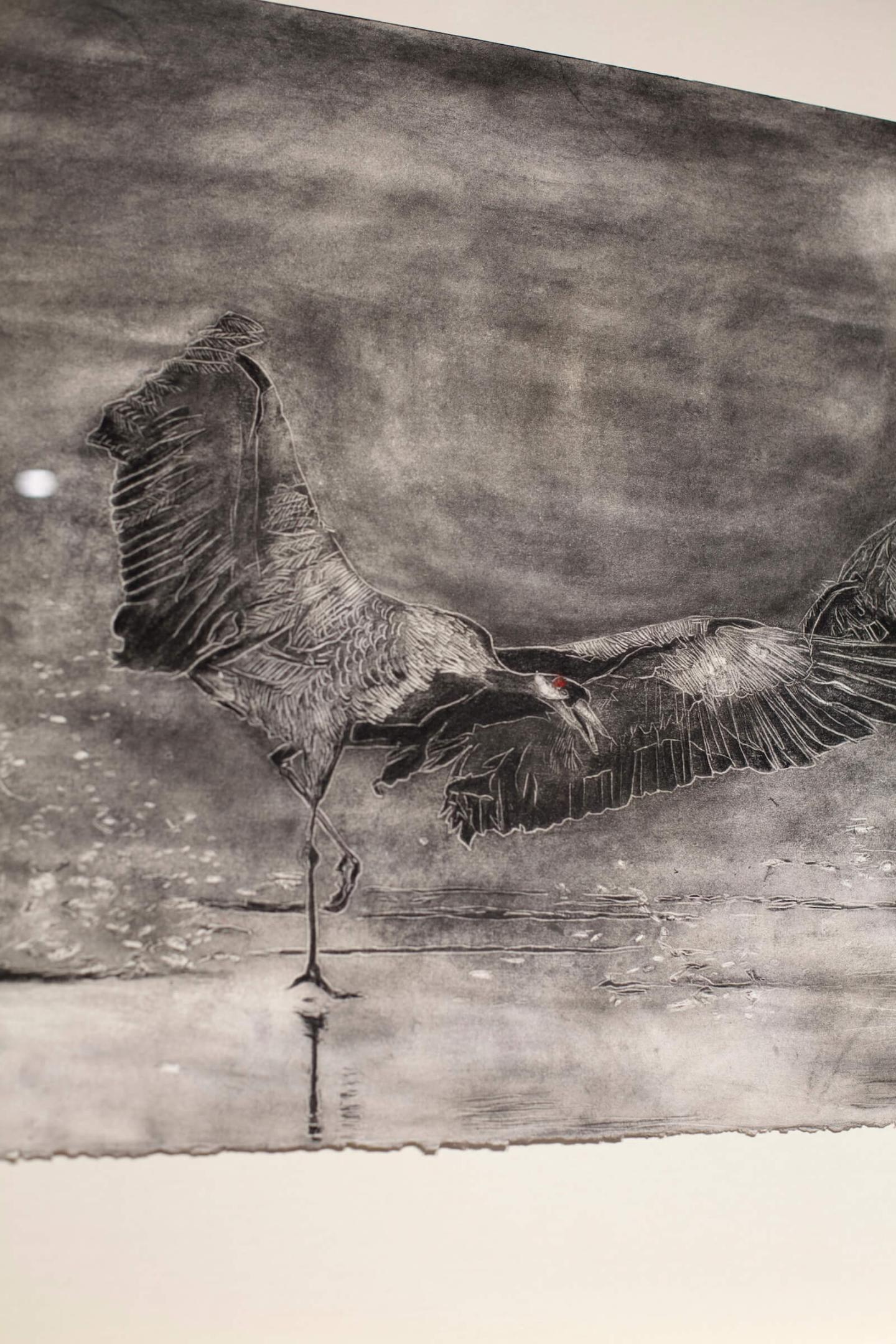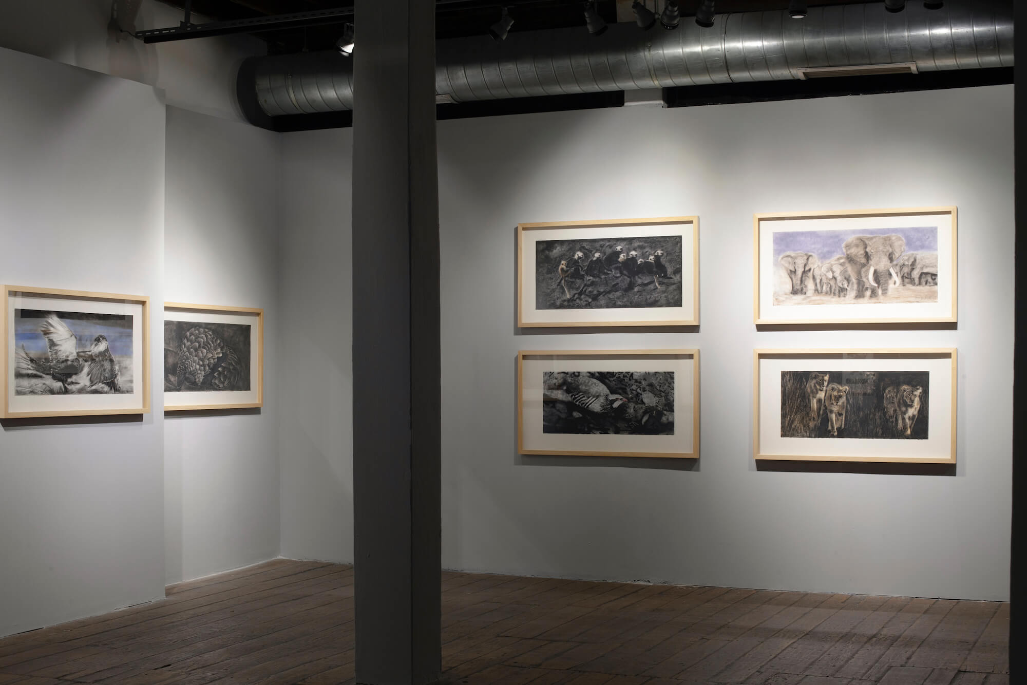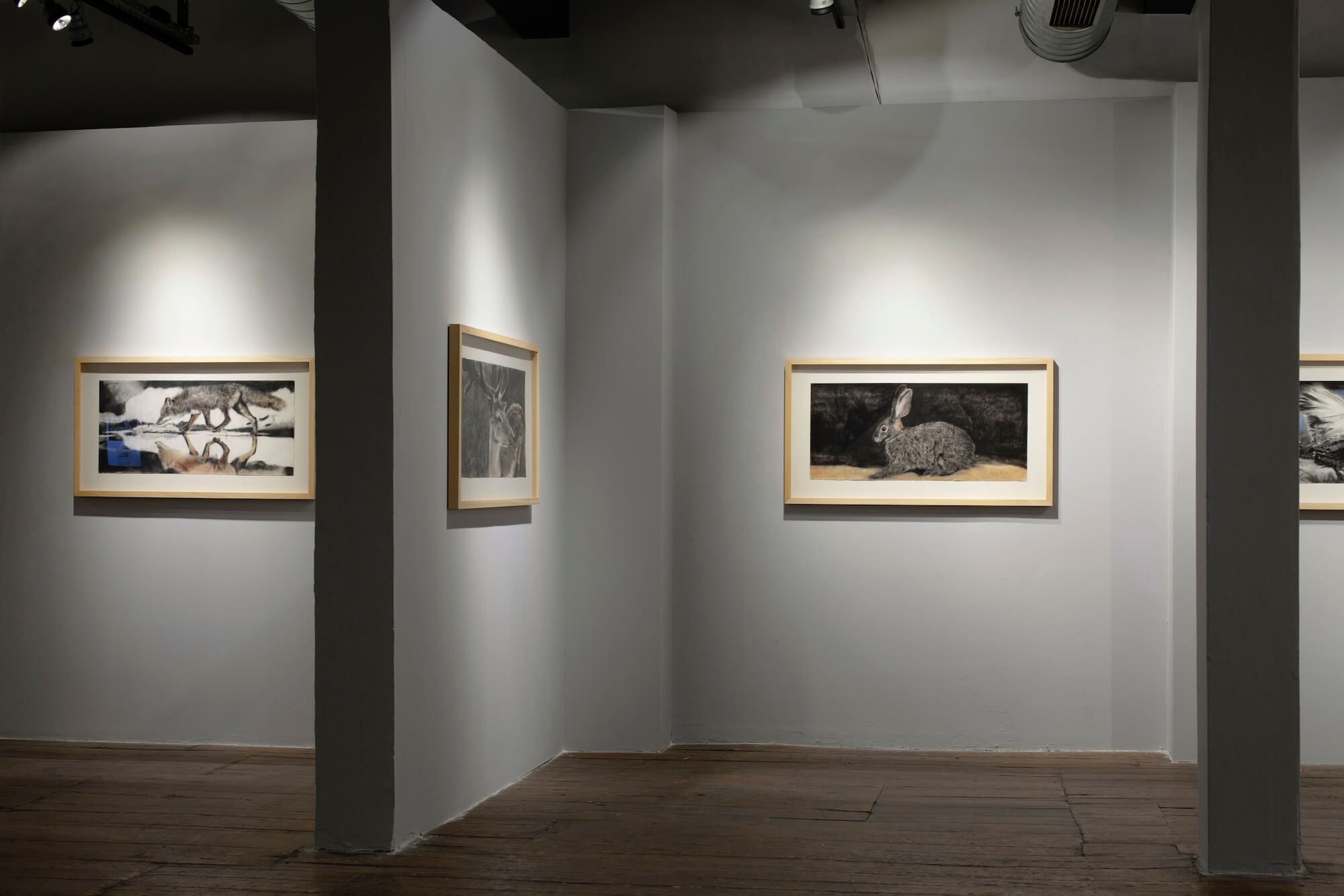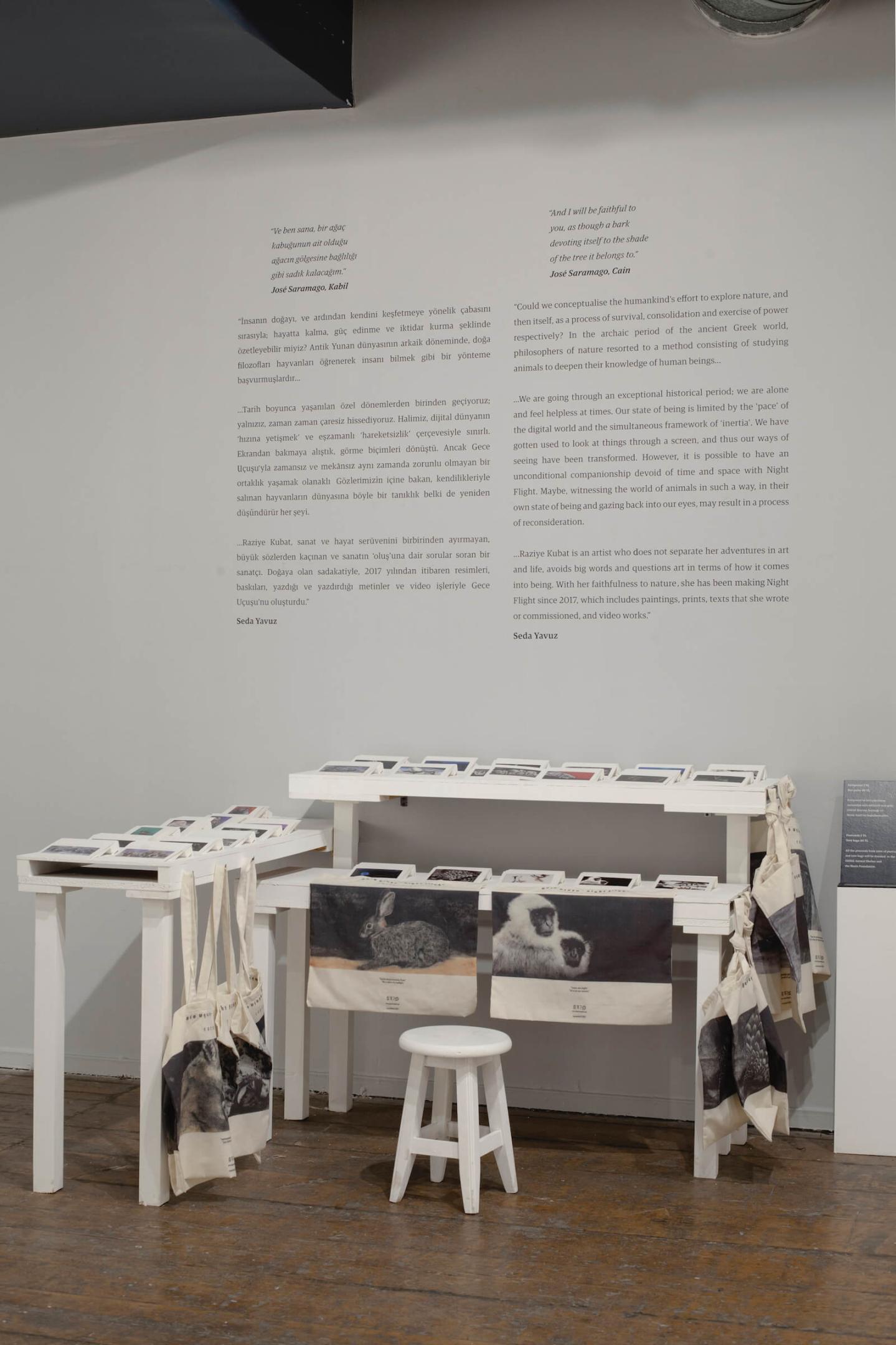 In her text presenting the exhibition, Seda Yavuz writes: “The exhibition’s formal composition and its world of meanings are rather intertwined, but their mutual implication is in constant motion. In her artistic process, which casts the text as the transmitter, she emphasises the following thesis: ‘One is inclined to admire animals’ features they otherwise dislike or even are disgusted of in other things.’ We humans manage to alienate ourselves from anything we perceive to be ‘other’ or different without further thinking. Our sense of vision remains unchallenged by our other senses due to its predominant exercise and influence for thousands of years. Night flight may be carried out by a keen-eyed nocturnal owl or a blind eagle. Here, the main subject is the one who senses by intuition, rather than whose vision is the most developed. The experiences of animals of different kind come to life again in the exhibition thanks to the gesture of the artist, and we, the audience, have a chance to look once again at what we may have missed to see. Animal figures also evoke expression with their movements, as opposed to their individual existence. The artist gracefully liberates these animals, whose photographs were taken and isolated from their private environment to then become data in the virtual world.”